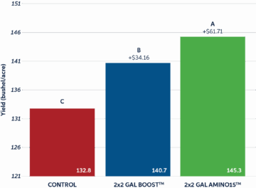 BOOST™ increased yield by 7.9 bu/ac, while Amino15™ produced a gain of 12.5 bu/ac (Figure 3). Only 100 lb of pre-plant nitrogen was applied, yet both treatments improved performance beyond the control yield of 132.8 bu/ac. These results suggest that L-CBF products can complement lower fertilizer programs by improving nutrient use efficiency.
